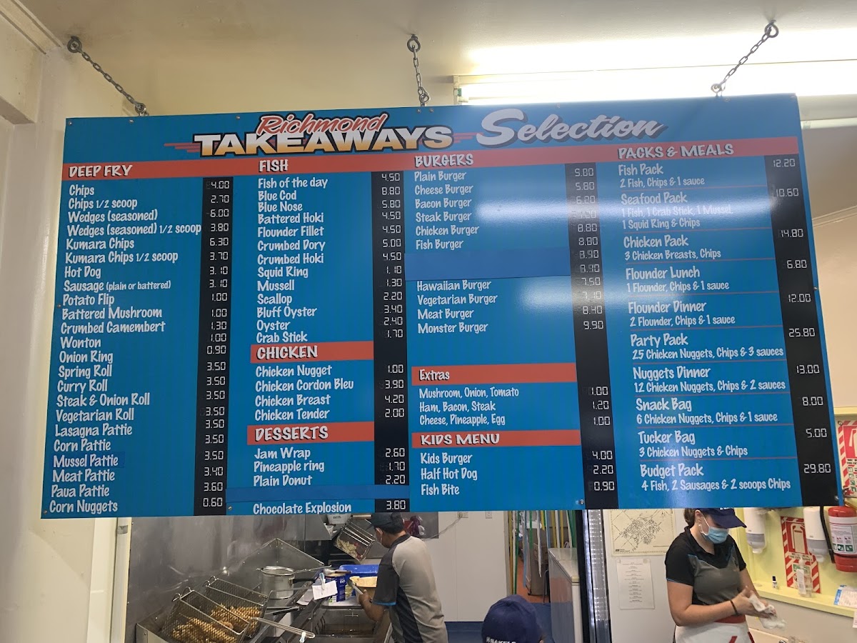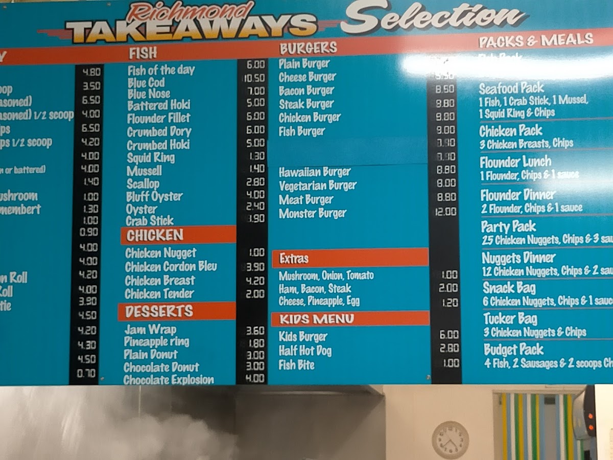Overall, the menu at Richmond Takeaways offers a classic, no-frills selection that focuses on variety and comfort food staples, making it easy to find something satisfying for any craving. The Deep Fry section stands out with familiar favorites like Chips, Chips 1/2 Scoop, Wedges, Wedges (Seasoned) 1/2 Scoop, and Kumara Chips, perfect as sides or quick bites. Seafood lovers are well catered for with options such as Fish Of The Day, Blue Cod, Blue Nose, Battered Hoki, and Flounder Fillet, while the chicken range-including Chicken Nugget, Chicken Cordon Bleu, Chicken Breast, and Chicken Tender-adds hearty variety. The burger lineup, featuring Plain Burger, Cheese Burger, Bacon Burger, Steak Burger, and Chicken Burger, keeps things simple yet satisfying. For those wanting a more complete meal, the Fish Pack, Seafood Pack, Chicken Pack, Flounder Lunch, and Flounder Dinner provide convenient combos. Sweet treats like Jam Wrap, Pineapple Ring, Plain Donut, Chocolate Donut, and Chocolate Explosion round out the experience, while extras such as Mushroom and Cheese allow for customization. The inclusion of a kids-friendly selection-Kids Burger, Half Hot Dog, and Fish Bite-makes the menu approachable for families. Altogether, it’s a straightforward, well-rounded takeaway menu that emphasizes classic favorites over complexity.
